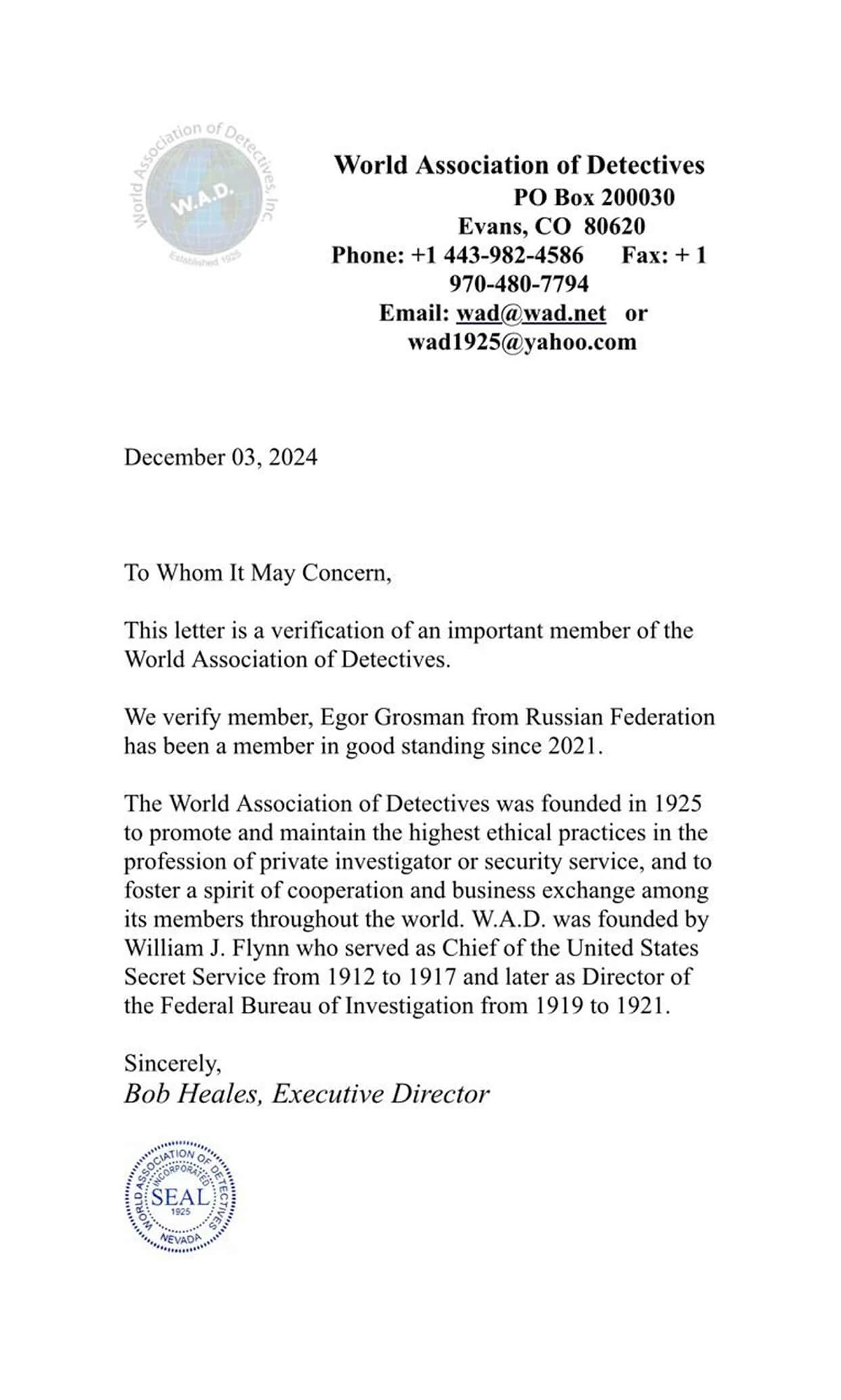 Grosman Investigations — ваш союзник в частных и корпоративных делах в России и 75+ странах. Лицензия, WAD, 9+ лет практики.